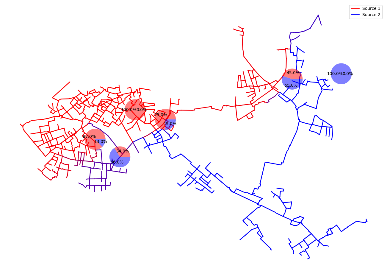 For each pipe a color (between A: red and B: blue) is mixed based on the srcvector present in its start and end node.